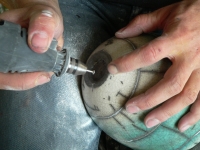 Nach und nach kommt dann das Objekt zutage. In einer weiteren Nacharbeit wird Blattgold in tiefere Risse und Ritzungen eingelegt. Goldlinien auf der Außenhaut und lüstern schimmernde Glasuren im Inneren des Gefässes beflügeln die Phantasie des Betrachters. Das feine Netz des Craquellees wird noch einmal in wenigen Linien hervorgehoben. Ein Schatz entsteht.
