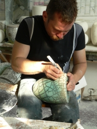 Glasur aufgebracht werden, die teils mit Metallsalzen versehen ist. Die Glasur muß staubtrocken auf dem Gefäss haften, bevor es in den gas-befeuerten Raku-Ofen gesetzt wird. Es vergehen ca 12 Stunden bevor die Temperatur um/bei 1000 Grad die Glasur flüssig/glänzend erscheinen lässt. Es wird sozusagen auf Sicht gebrannt. Nur mit Schutzkleidung kann Mindermann jetzt arbeiten. Hitze schlägt ihm aus dem geöffneten Ofen entgegen. Mit Zangen greift er ein glühendes Gefäss heraus. Der Temperaturschock dem der Scherben ausgesetzt wird ist gewaltig. Die Glasurhaut reißt, auch für das Ohr deutlich wahrnehmbar. Ein Craqueleenetz zeichnet sich