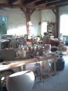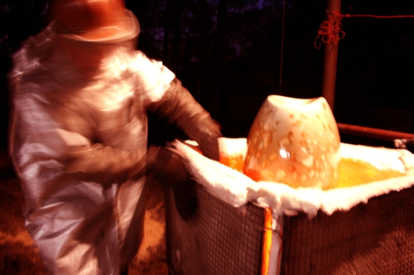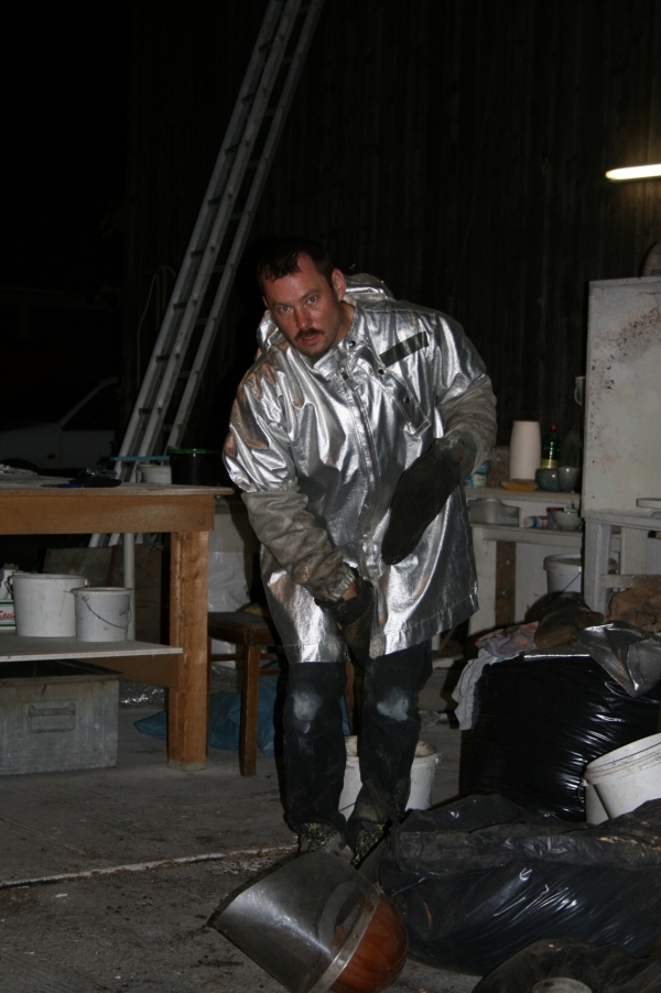 Glasur aufgebracht werden, die teils mit Metallsalzen versehen ist. Die Glasur muß staubtrocken auf dem Gefäss haften, bevor es in den gas-befeuerten Raku-Ofen gesetzt wird. Es vergehen ca 12 Stunden bevor die Temperatur um/bei 1000 Grad die Glasur flüssig/glänzend erscheinen lässt. Es wird sozusagen auf Sicht gebrannt. Nur mit Schutzkleidung kann Mindermann jetzt arbeiten. Hitze schlägt ihm aus dem geöffneten Ofen entgegen. Mit Zangen greift er ein glühendes Gefäss heraus. Der Temperaturschock dem der Scherben ausgesetzt wird ist gewaltig. Die Glasurhaut reißt, auch für das Ohr deutlich wahrnehmbar. Ein Craqueleenetz zeichnet sich