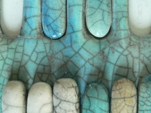 Die Oberfläche meiner Gefäße lassen sich wie Bilder oder Landkarten lesen: Ozeane und Inseln entstehen zwischen dem rakugefärbten Craquelé, den nicht eingefärbten Sprüngen und den nicht gezeichneten Flächen. Die feinen Haarrisse geben der Glasur opake Tiefe und gleichzeitig etwas Brillantes.