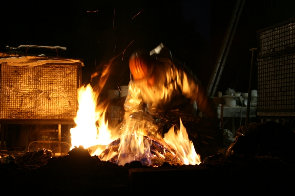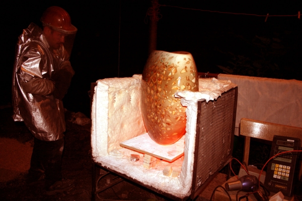 Der Rakubrand führt das Material an die Grenze seiner Belastbarkeit. Ich will es dabei aber nicht alleine lassen. Die farbliche Entfaltung der Glasur und die Entstehung der Spannungsrisse in der Haut des Gefäßes möchte ich nicht elektronischer Steuerung überlassen, sondern so weit wie möglich beeinflussen.